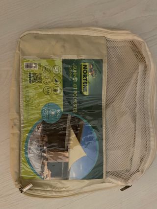 Toldo triangular blanco, está nuevo a estrenar. Lo abrí pero al probarlo en mi terraza, vi que era demasiado grande y lo volví a plegar al momento.
