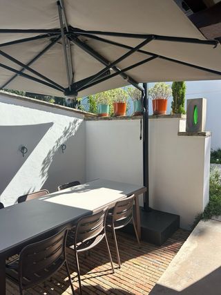 Lo compré el verano pasado y no lo usé por mudanza. Es mas grande para mi nuevo balcon. Funciona perfectamente y se ve bien. Consulta las buenas reseñas de Amazon 🤗 Precio in Amazon: Parasol 40€, Base 90€