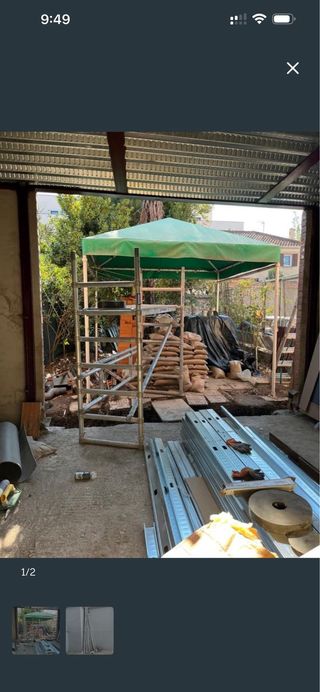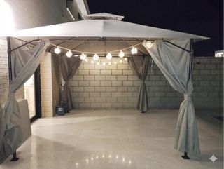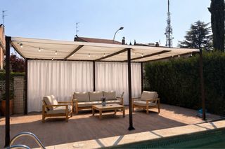Pérgola de jardín con estructura metálica y cubierta de tela.Mosquetera, barra y ganchos para colgarla.comprada en leroy Merlin y usada un par de meses porque hicimos una de obra. En la última foto se puede ver la factura.