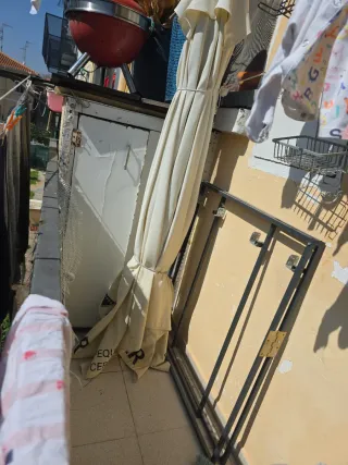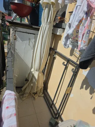 La base está un poco oxidada y la tela un poco rota Sombrilla de exterior con su base incluida, ideal para disfrutar de días soleados en tu terraza o jardín. - Estructura de metal resistente. - Tela de alta calidad.
