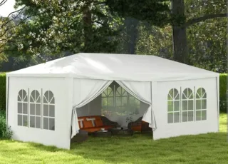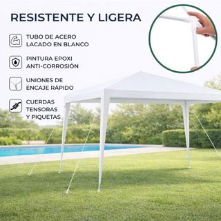 Carpa de 3x6 metros, ideal para eventos o exteriores. Incluye laterales y puerta. - Montaje sencillo. - Diseño práctico y funcional.