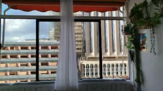 Preciosa pantalla enrollable para exterior. Es de color beige y está hecha de resistente tela, 100% poliéster, repelente al agua y protección UV. - Ideal para balcones o terrazas. - Sistema de enrollamiento manual.