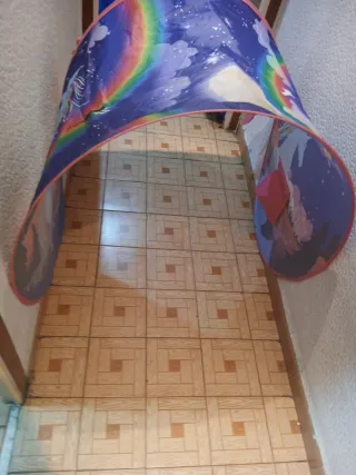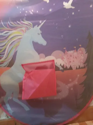 Divertida carpa infantil con un diseño de unicornio y arcoíris. - Estampado de arcoíris y estrellas. - Tonos azules y multicolores. - Borde de color rosa.