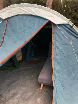 Carpa de camping lista para tu próxima aventura. - Materiales resistentes de nylon y poliéster. - Diseño en colores naranja y azul verdoso.