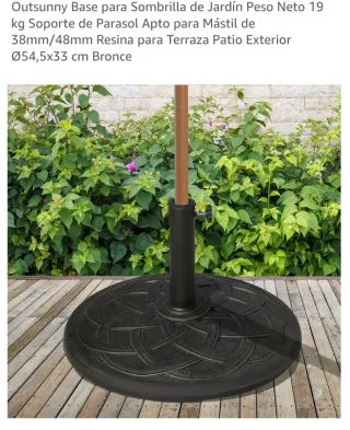 Sombrilla de exterior en color negro. Como nueva. De tela resistente y estructura de aluminio y acero. Ideal para terrazas o jardines. Se incluye: - Una base redonda de hormigón para sombrilla, 10 kg, con tensor de tornillo ajustable para mantener tu paraguas seguro. - Bolsa de peso de agua para darle más peso de base a la sombrilla. Muy práctica ya que solo se rellena de agua. Se mantiene estable en vientos fuertes. --- MEDIDAS: Sombrilla: - Diámetro: 270 cm - Altura: 240 cm - Diámetro del poste: 38 mm - Peso: 5 kg Base de cemento: - Tamaño: 50 x 37 cm. - Peso: 25 kg Bolsa de agua: - Diámetro: 90 cm - Capacidad: 50 kg