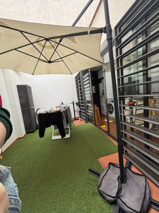 Sombrilla grande de exterior, perfecta para tu jardín o terraza. Su diseño en color beige se adapta a cualquier ambiente. 3*3 metros, estructura en perfecto estado. - Estructura metálica. - Tela de alta resistencia. Recogida en Begues. Posibilidad recogida en Barcelona, previo pago 50%