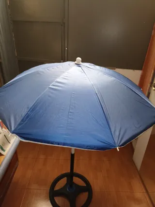 - Sombrilla de playa pequeña lista para usar. - Su diseño la hace práctica para llevar a la playa o al jardín. - Color azul vibrante exterior y filtro ultravioleta interior . ( Le falta el cono de tubo qué clava en la arena ) - Usada , en muy buen estado - Medidas : 140 Cms de Diámetro .