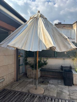 Tiene pequeñas roturas y algo de moho por haber estado años en el exterior. Toldo de exterior con una base resistente. - Toldo de tela. - Base de piedra.