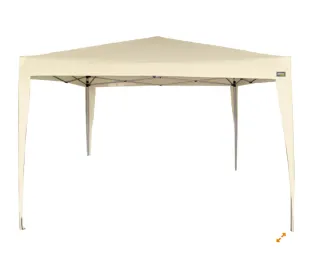 Cenador de 3x3 metros, ideal para protegerse del sol y la lluvia. - Estructura de metal. - Cubierta de tela impermeable. La cremallera de la bolsa de transporte está rota. Pero el cenador está perfecto. Solamente se uso una vez