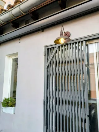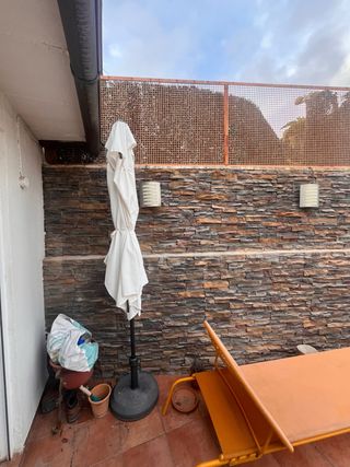 Sombrilla de exterior para hostelería. Hay una que tiene un palo pequeño suelto. - Estructura de metal. - Tela resistente de color beige con detalles en negro. 40€ las dos