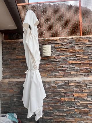 Sombrilla de exterior para protegerte del sol. - Base de metal y mástil de plástico. - Tela de color blanco.