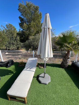 ⛱️ Sombrilla colgante de jardín con base incluida – ¡Listo para disfrutar del verano! 🌞 Convierte tu terraza o jardín en un oasis de sombra y confort. Te traigo esta sombrilla colgante de gran tamaño (≈3 metros), con: ✔️ Estructura metálica reforzada para mayor estabilidad. ✔️ Base de 4 contrapesos incluida (normalmente se vende aparte). ✔️ Lona en color beige, elegante y que combina con cualquier espacio. ✔️ Sistema de apertura lateral, muy cómodo. 📦 Precio nueva: entre 280 y 400 €. 👉 La dejo en 140 euros. Tengo la factura.