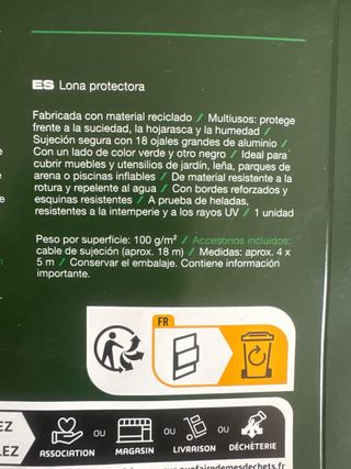 Toldo de polietileno blanco con tratamiento anti UV, ideal para exteriores. - Medidas: 4x6 metros. - Muy resistente y multiusos. - Fácil instalación. - Gramaje: 95g/m2. Nota: sin usar y recién empaquetado. Solo ha entrado un poco de agua de lluvia en el embalaje.
