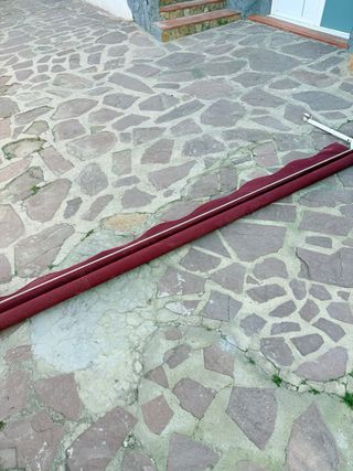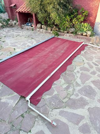 Toldo de tela en color rojo, ideal para exteriores. Se encuentra desplegado y listo para su instalación o almacenamiento. - Estructura metálica. - Borde inferior con diseño ondulado.