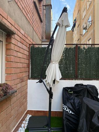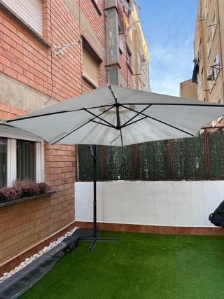 Sombrilla de gran tamaño para exteriores, ideal para disfrutar de tu terraza o jardín. - Diámetro de 270cm. Comprado en Beliani por 129 euros. - Incluye base de acero inoxidable para gran estabilidad: 14kg. Aguanta bien el viento zaragozano. Comprada en amazon por 45 euros. - Diseño elegante en color beige. - Permite inclinarse en ángulo de 45% - Funciona con manivela, que permite su apertura a cualquier amplitud. - Perfecto estado. Poco uso y siempre ha dormido en interiores. - Venta por mudanza. PD: mesa y sillas de la terraza no incluidas.