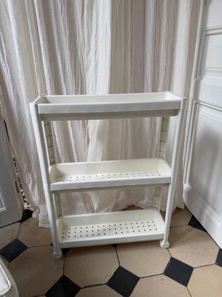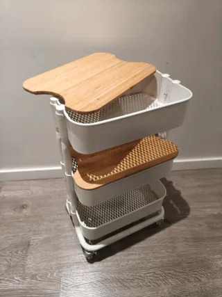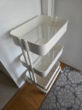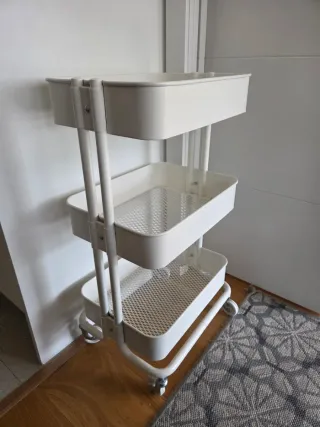 Carrito auxiliar metálico blanco mate de Ikea, completamente nuevo y sin usar. Lo compré hace 2 semanas pero no lo voy a utilizar. Ideal para organizar cualquier espacio. Medidas en la última foto. El precio en tienda es de 29,90€. Lo vendo por 25€, ventaja de que ahorras y te lo llevas montado. Cualquier pregunta, no dudes en contactarme!