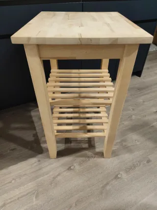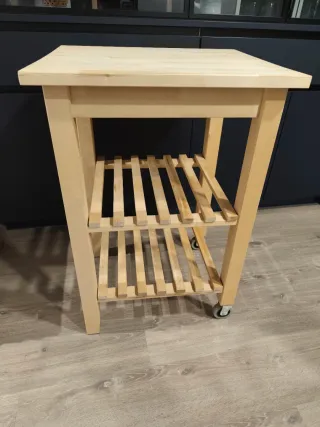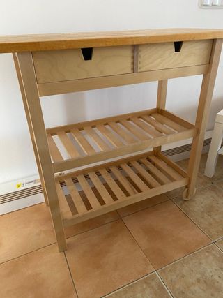 Carrito de cocina Ikea Bekman en buen estado. Ideal para almacenar y organizar tus utensilios de cocina. - Estructura de madera maciza. - Dos estantes para mayor capacidad de almacenaje. - Ruedas para facilitar su movilidad. - Superficie de trabajo amplia