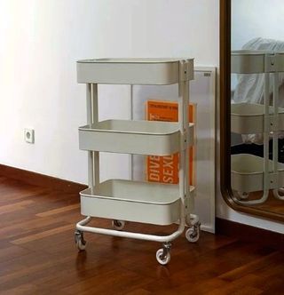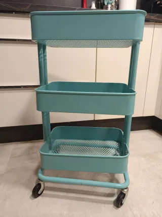 Práctico carrito de almacenaje multiusos con tres niveles y ruedas. De Ikea, modelo Raskog. Encaja en donde sea, en la cocina, el salon, el cuarto de juegos, oficina... Y al tener ruedas es muy fácil de mover de aquí para allá. Muy robusto (cuerpo de metal y bandejas de malla metálica).
