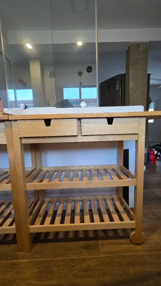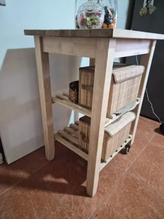 Mesa auxiliar de cocina con ruedas, ideal para organizar tu espacio. - Dos cajones superiores. - Dos estantes inferiores. - Ruedas para fácil movilidad. Precio nuevo 149€ (ahorras 65€ y el montaje). Tengo dos unidades, si te llevas ambas hago buen precio.