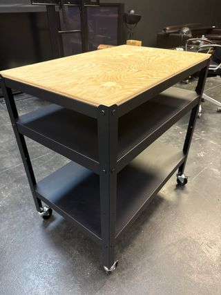 Mueble auxiliar de cocina con estructura metálica, encimera de madera maciza y ruedas. Muy estable y funcional, ideal como isla, apoyo o almacenaje. Buen estado general. Perfecta para cocinas con poco espacio o estilo industrial.