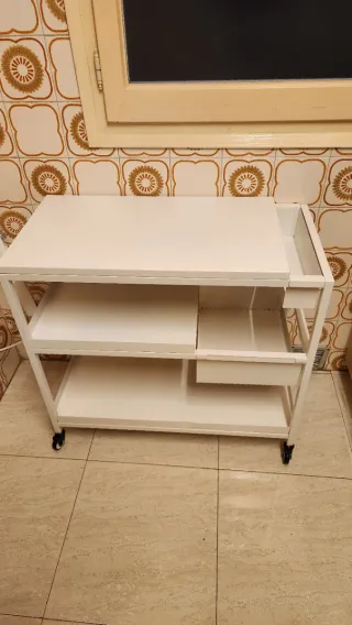 Carrito auxiliar metálico blanco mate de Ikea, completamente nuevo y sin usar. Lo compré hace 2 semanas pero no lo voy a utilizar. Ideal para organizar cualquier espacio. Medidas en la última foto. El precio en tienda es de 29,90€. Lo vendo por 25€, ventaja de que ahorras y te lo llevas montado. Cualquier pregunta, no dudes en contactarme!