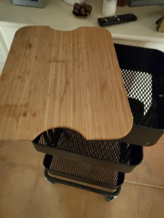 Carrito de almacenamiento de tres niveles de IKEA con tapa. Ideal para organizar tus pertenencias en cualquier espacio. - Diseño moderno y funcional. - Estructura metálica resistente. - Bandejas con rejilla para ventilación. - Tapa de madera de bambú.