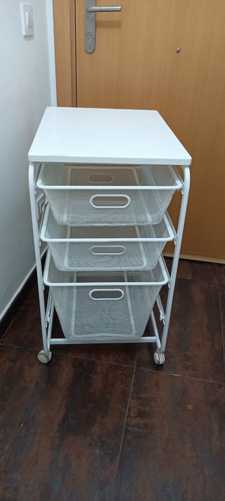 Carro almacenaje Balda superior madera blanca Dos cestas pequeñas y una mediana