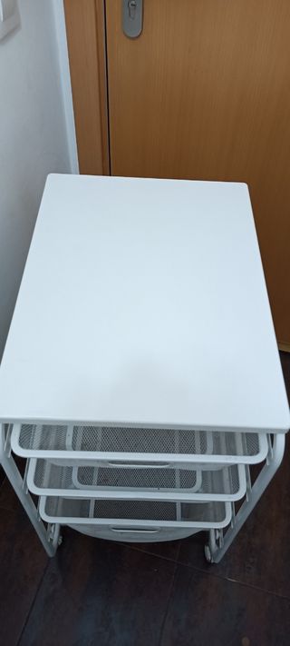 Carrito auxiliar de tres niveles con estructura metálica y bandejas de malla. - Diseño moderno y funcional. - Ideal para organizar objetos en cualquier espacio. - Fácil de mover gracias a sus ruedas. Evidentemente se entrega limpio