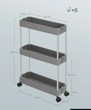 ¡Le falta 1 tapón! SONGMICS Carro de Almacenamiento de 3 Niveles, Carrito con Ruedas, Carro de Cocina, Ahorro de Espacio, para Baño, Oficina, 14,4 x 42 x 60,6 cm, Gris Paloma KSC007G01 Tipo de estante3 estantes MaterialPlástico PP (Polipropileno), Tubo de Acero Inoxidable Material del marcoMetal MarcaSONGMICS ColorGris Paloma Optimiza espacios pequeños: Diseñado para aprovechar cada centímetro, este carrito de almacenamiento delgado de 14,4 x 42 x 60,6 cm se adapta perfectamente a espacios estrechos en cocinas, cuartos de lavado o baños Prácticos ganchos extraíbles
