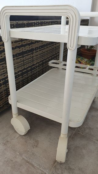 Preciosa carretilla de servicio de los años 70. Ideal para darle un toque retro a tu hogar. - Dos bandejas. - Estructura metálica. - Ruedas funcionales. - Se encuentra en buen estado de conservación.