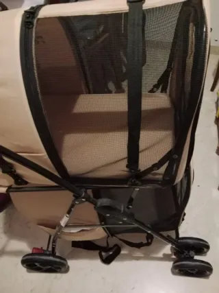 Carrito para transportar mascotas, ideal para perros o gatos. Su diseño permite llevar a tu mascota de forma cómoda y segura. Solo se ha usado en tres ocasiones. - Estructura resistente. - Amplias zonas de ventilación. - Ruedas para fácil movilidad.