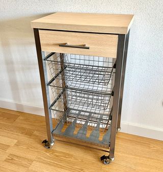 Práctico carro verdulero con una estructura metálica y encimera de madera. - Tres niveles de cestas de rejilla. - Encimera de madera clara. - Estructura metálica resistente.