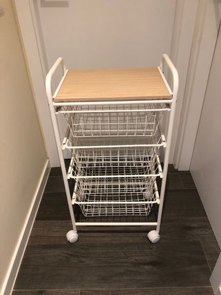 Pequeño carro de cocina o verdulero en ruedas de estructura metalica, nuevo en su embalaje de plastico. Tiene 3 cestas en 3 niveles.