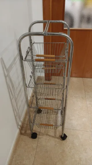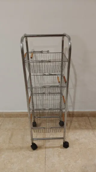 Bonito carro frutero de acero, ideal para organizar frutas y verduras en la cocina. Tiene cuatro cestas, que se sacan con solo levantsrlas. Es de color plateado y está en buen estado. - Carro de cuatro cestas. - Perfecto para la cocina
