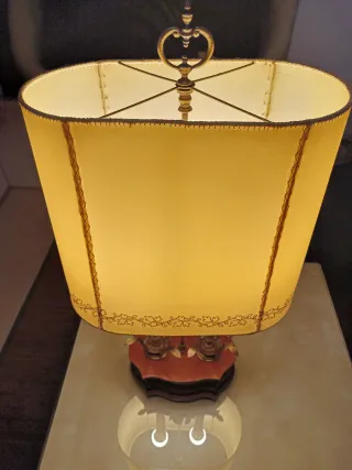 Elegante Lámpara de mesa Art-Nouveau de 2 Luces de Estilo Victoriano. Es del tipo de Lámpara conocida como "Bouillotte" (Estilo de Lámpara diseñada en Francia a finales del siglo XVIII, durante el reinado de Luis XVI, que toma su nombre de un popular Juego de Cartas de la época llamado "bouillotte", precursor del póquer). Combina una Base maciza de Madera Noble Lacada en rojo con Brazos y Ornamentos de Latón y Bronce, junto con una Enorme y ovalada Pantalla de Tela de Pergamino. Su diseño es Atemporal y Sofisticado, evocando un Estilo Retro o Antiguo. - Medidas: 86 cm de alto. Base de madera de 27 x 17 cm. Tulipa ovalada de 42 x 2