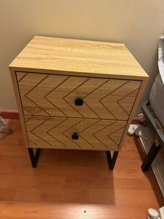 Mesitas de noche con un diseño moderno y funcional dos unidades - Estructura principal de madera. - Patas y detalles metálicos. - Incluye accesorios de montaje. Tiene una pequeña postilla