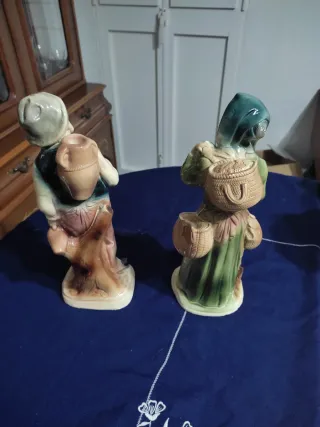 Bonita pareja de figuras de escayola que representan a unos abuelos de campo. Son piezas decorativas con mucho encanto. - Miden 36 cm de alto. - Pesan aproximadamente tres kilos entre las dos (no están huecas) - Figuras de escayola, revestidas con colores brillantes - Representan a una pareja de ancianos. - Detalladas vestimentas tradicionales.