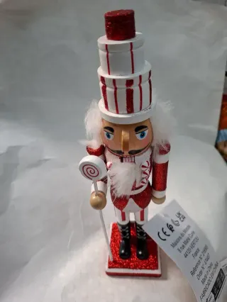 Figura decorativa de cascanueces, Alt 28 cm. Fabricado en madera. en rojo y blanco con purpurina. Nuevo. - Incluye un bastón de caramelo.