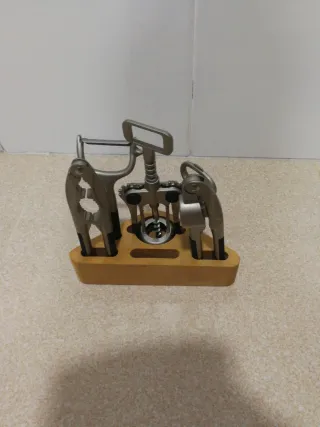 Conjunto de utensilios para vino y cocina. - Base de madera. - Sacacorchos de metal. - Abrebotellas de metal. - Cascanueces de metal. - Abridor de latas de metal.
