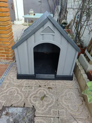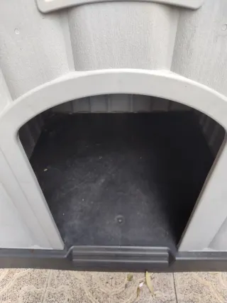 Caseta para perros de tamaño grande, ideal para exteriores. Su diseño robusto y material resistente la hacen perfecta para proteger a tu mascota. Se compró este verano, no tiene prácticamente uso. A Recoger en Aldea del Fresno - Color gris. - Techo a dos aguas. - Ventilación en la parte superior.