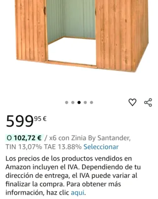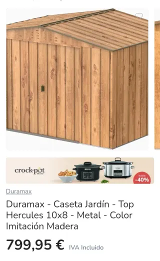 Caseta de chapa para parcelas, completamente nueva y sin abrir. - Material: Chapa metálica. - Dimensiones: 8,3 m² (277x322x192 cm). - Color: Exterior oscuro. - Vendido por: Spanish Aosom, S.L. (EU). - Precio: 382,49€.