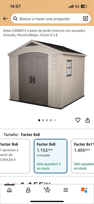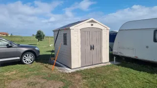 Caseta de jardín Keter Factor 8x8 - consultar medidas en Internet - Componentes de plástico PVC - Color beige y gris. La caseta se compro en octubre , a cuenta de los temporales se encuentra como en la foto N-5. Se encuentra en el Camping Cabo de Ajo, Cantabria.