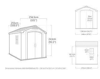 Caseta de almacenamiento de PVC, modelo Keter de 8x8 pies. Se encuentra sin estrenar y en su caja original. - Dimensiones exteriores: 256.5cm (ancho) x 243cm (alto) x 255cm (fondo). - Dimensiones interiores: 236.5cm x 238.5cm x 237cm. - Puerta con altura de 191cm. - Ventana lateral de 61cm x 43cm.