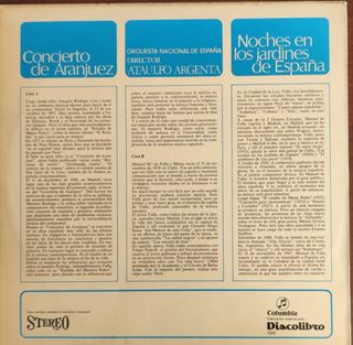 Disco de vinilo clásico en buen estado. Incluye las piezas Concierto de Aranjuez de Joaquín Rodrigo y Noches en los Jardines de España de Manuel de Falla. Interpretado por Ataulfo Argenta y la Orquesta Nacional de España. - Incluye el disco de vinilo. - Excelente estado de conservación.
