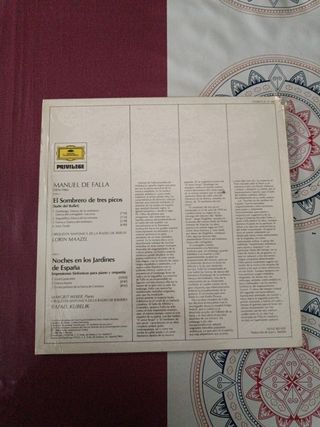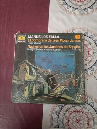 Disco de vinilo de Manuel de Falla. - Título: El Sombrero de tres Picos: danzas. - Incluye: Noches en los Jardines de España. - Intérpretes: Lorin Maazel, Margrit Weber, Rafael Kubelik.