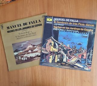 2 discos de vinilo de 33 rpm, de Manuel de Falla, "El sombrero de tres picos", "Noches en los Jardines de España", "El Amor Brujo", DISCOPHON (1974) y DEUTSCHE GRAMMOPHON (1981)
