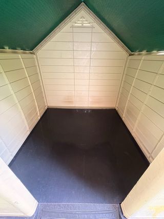 Caseta para perros de plástico resistente, ideal para exteriores. - Material: PVC duradero. - Diseño de casa con tejado a dos aguas. - Entrada arqueada. Está prácticamente nueva usada muy poquito.