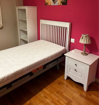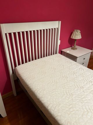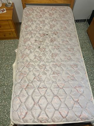 Se vende la cama con la estructura, somier y colchón. La estructura es de madera y hierro. El cabecero y los pies son de madera, unidos por dos barras de hierro resistente. Incluye todos los tornillos. El colchón es de 90cm de ancho, de muelles y tiene bastante uso. El somier es pikolin y de lamas de madera.