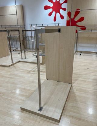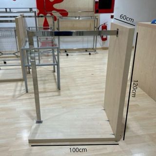 Mueble perchero de madera y metal, ideal para tiendas. - Base de madera de 100cm de largo. - Altura de la tabla lateral de 120cm. - Profundidad de la tabla lateral de 60cm. - Estructura metálica plateada.