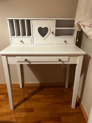 Bonito escritorio para niña con un diseño encantador. - Estructura de madera. - Acabado en color blanco. - Detalle de corazón en la puerta. - Compartimentos para organización. - Cajones con tiradores.
